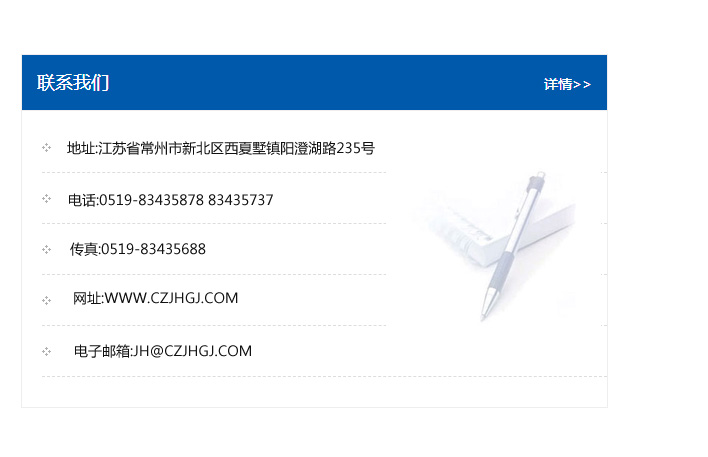 傳真:0519-83435688    郵編:213135    網址:WWW.czjhgj_com.kaiwensj.com    電子郵箱:JH@czjhgj_com.kaiwensj.com